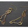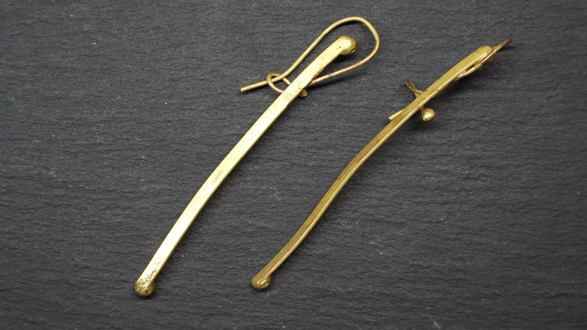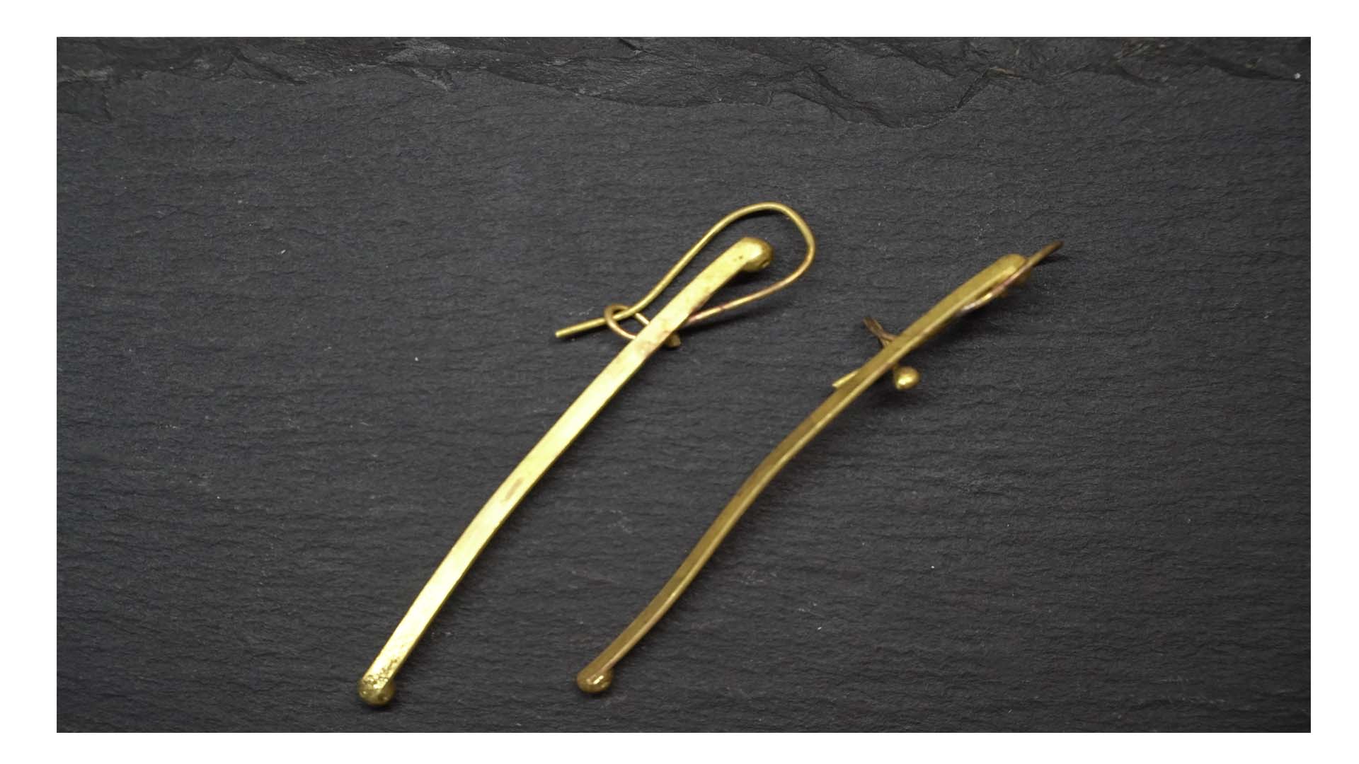 handmade earrings made of brass, soldered with silver. Their design is minimalist and elegant — thin, elongated forms with a slight curvature and small details at the ends, which makes them a unique piece of jewelry.
